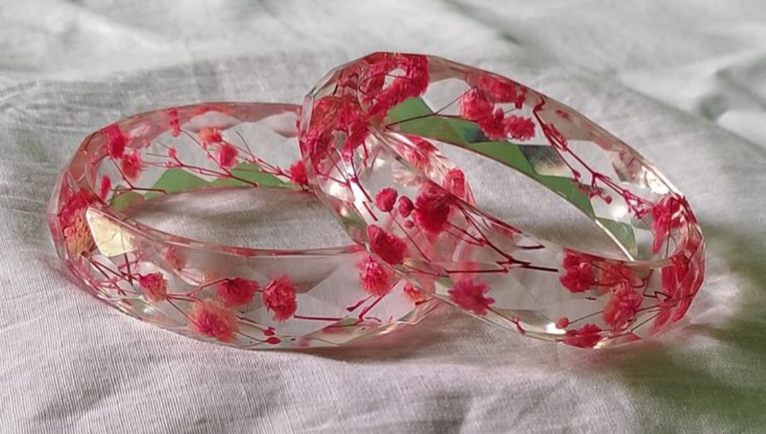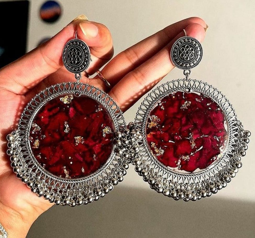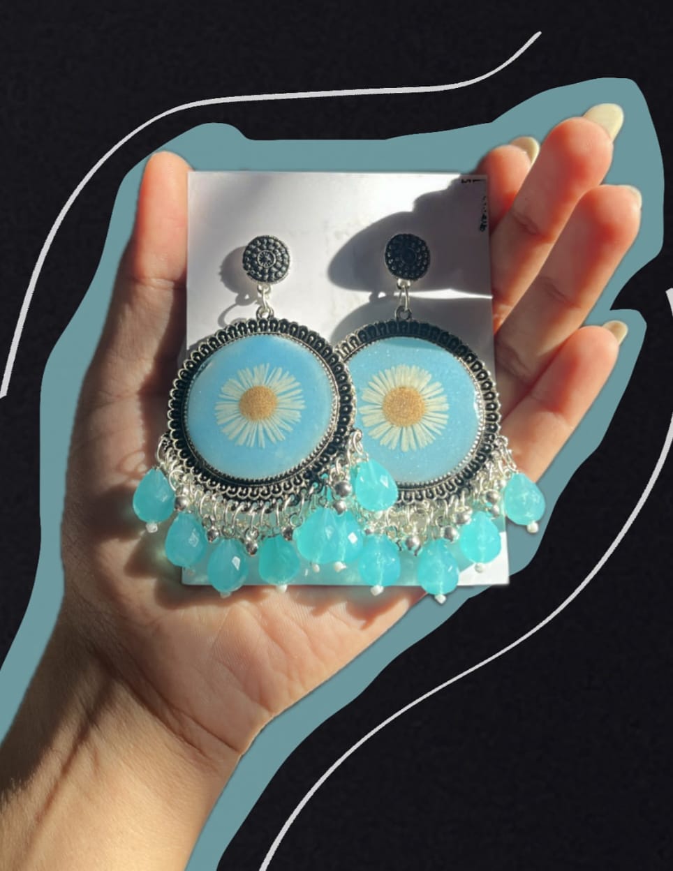 Elegant earrings featuring real pressed flowers encased in resin, framed with antique silver detailing and pastel beads.