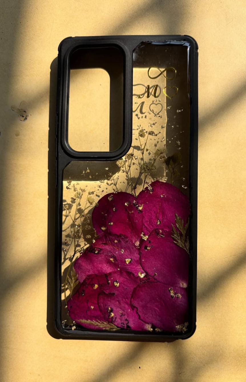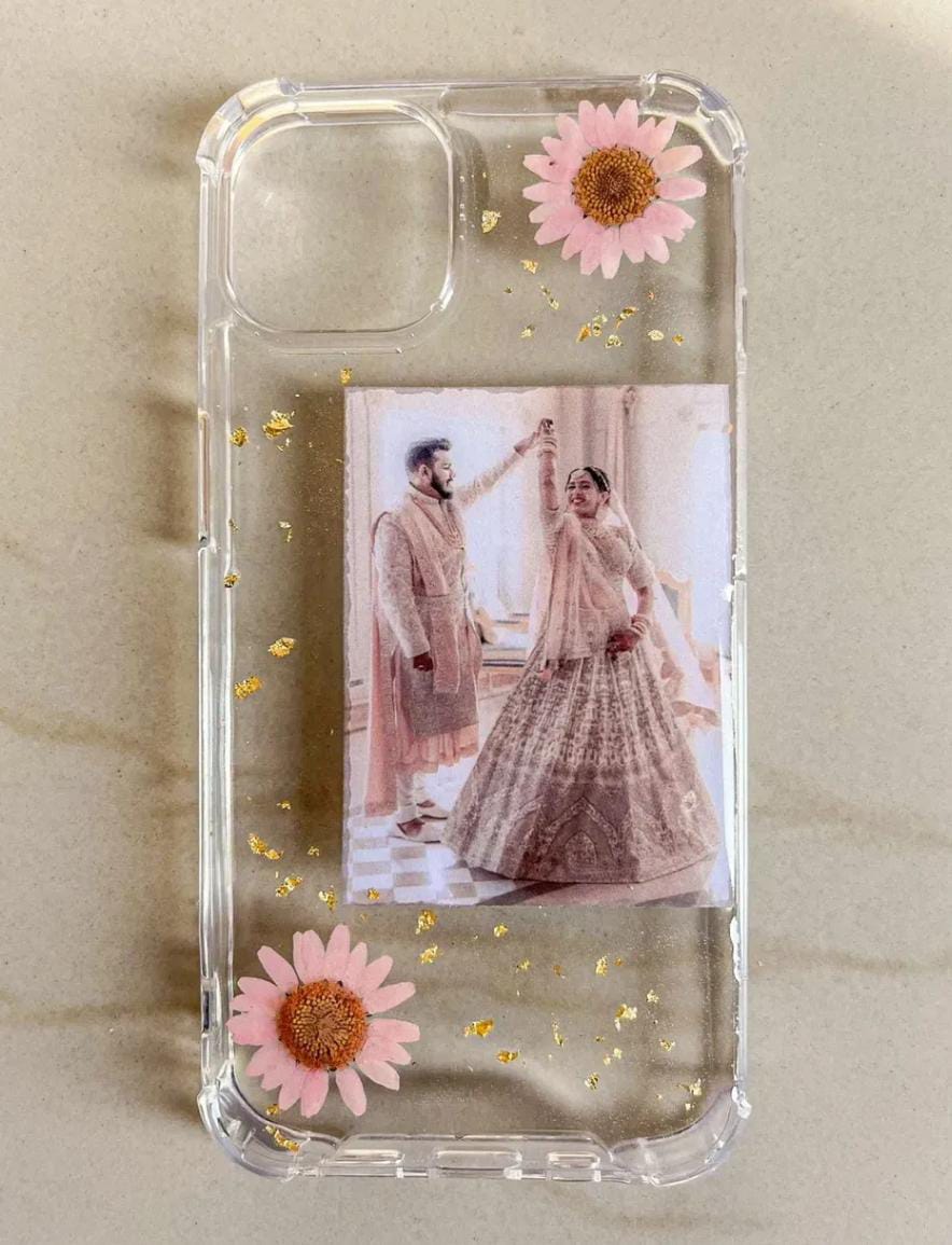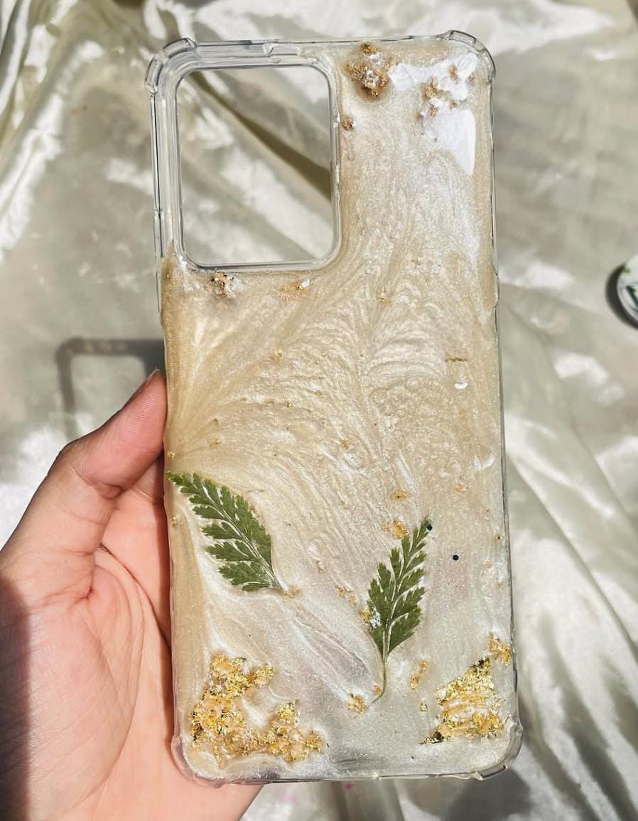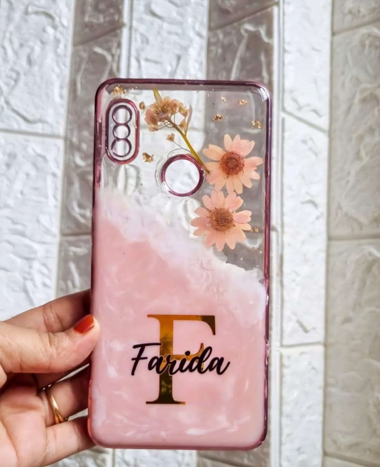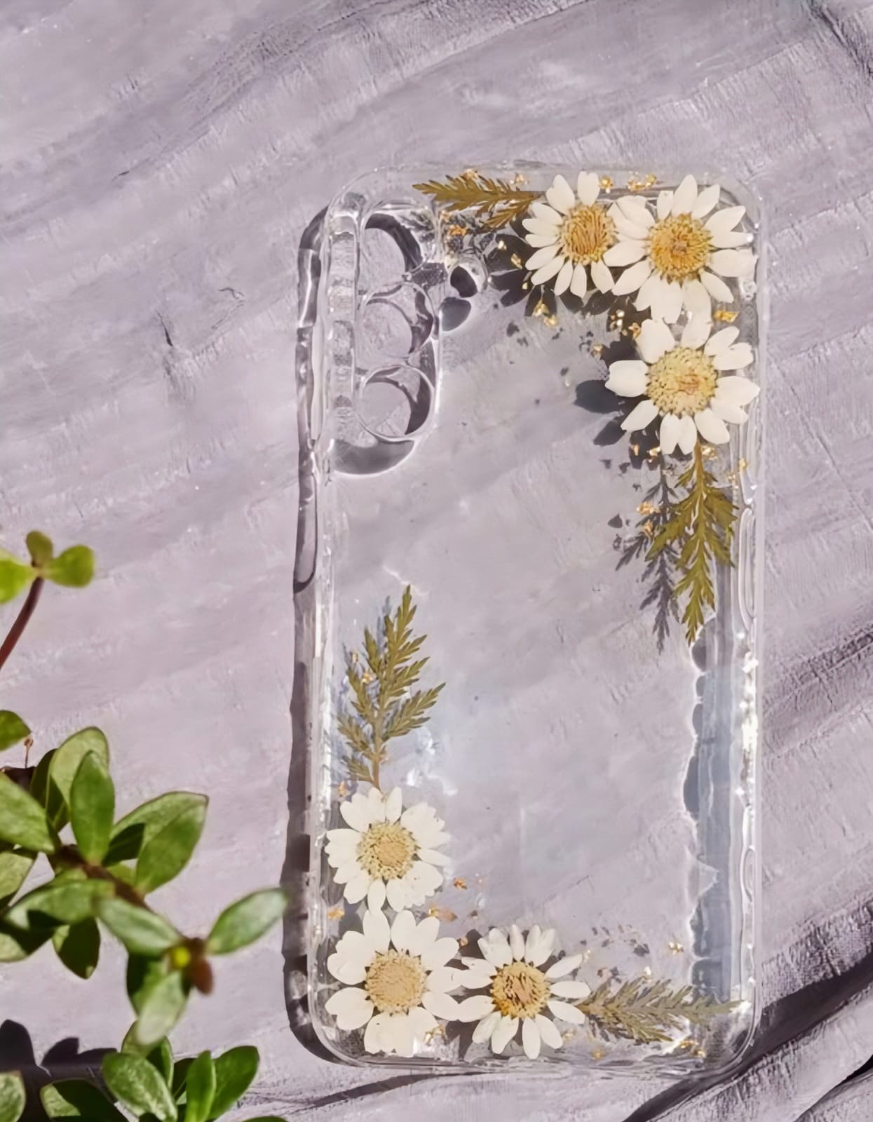 Stylish resin phone cover with embedded flowers and glossy finish. Durable, lightweight, and perfect for everyday protection with elegance.