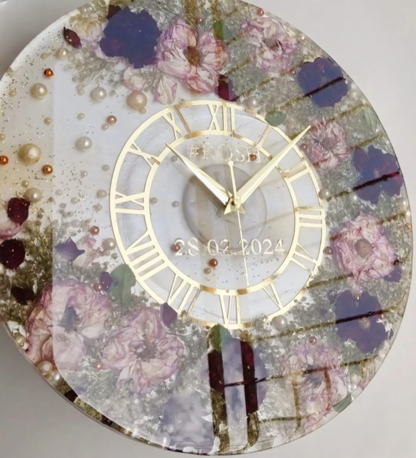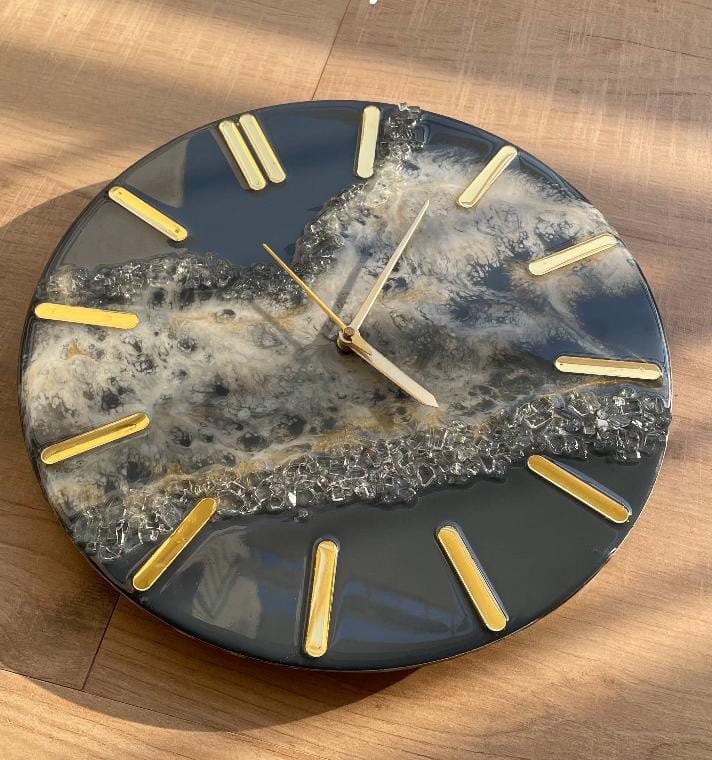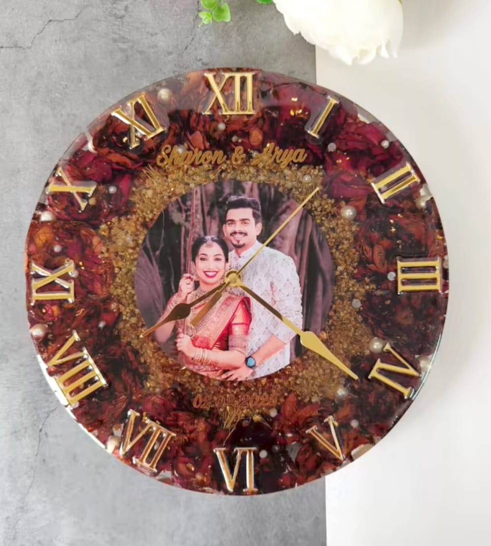 Elegant handcrafted resin wall clock with embedded flowers and premium finish. Silent movement, durable build, and a perfect statement piece for home décor.