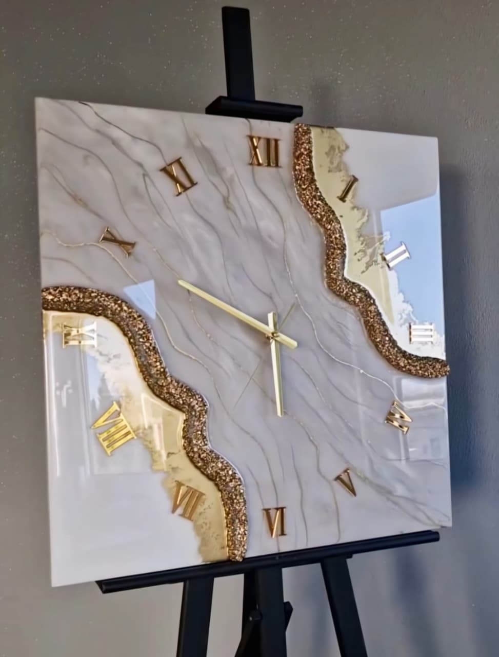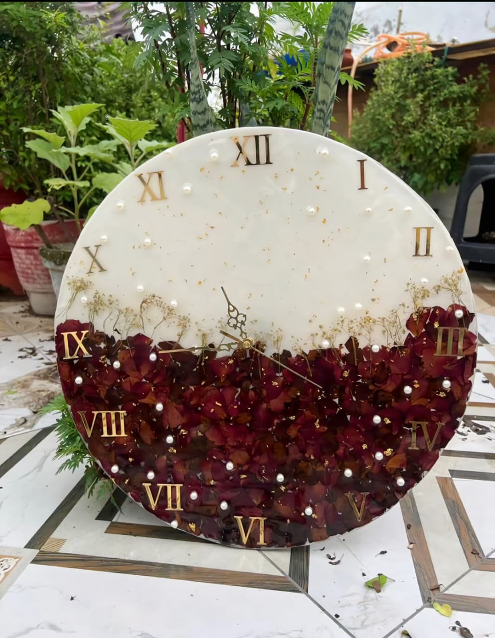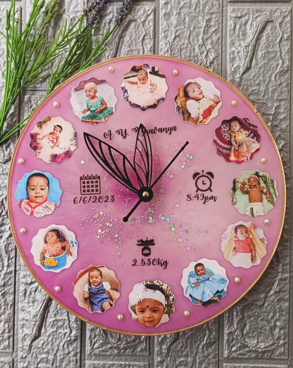 Elegant handcrafted resin wall clock with embedded flowers and premium finish. Silent movement, durable build, and a perfect statement piece for home décor.